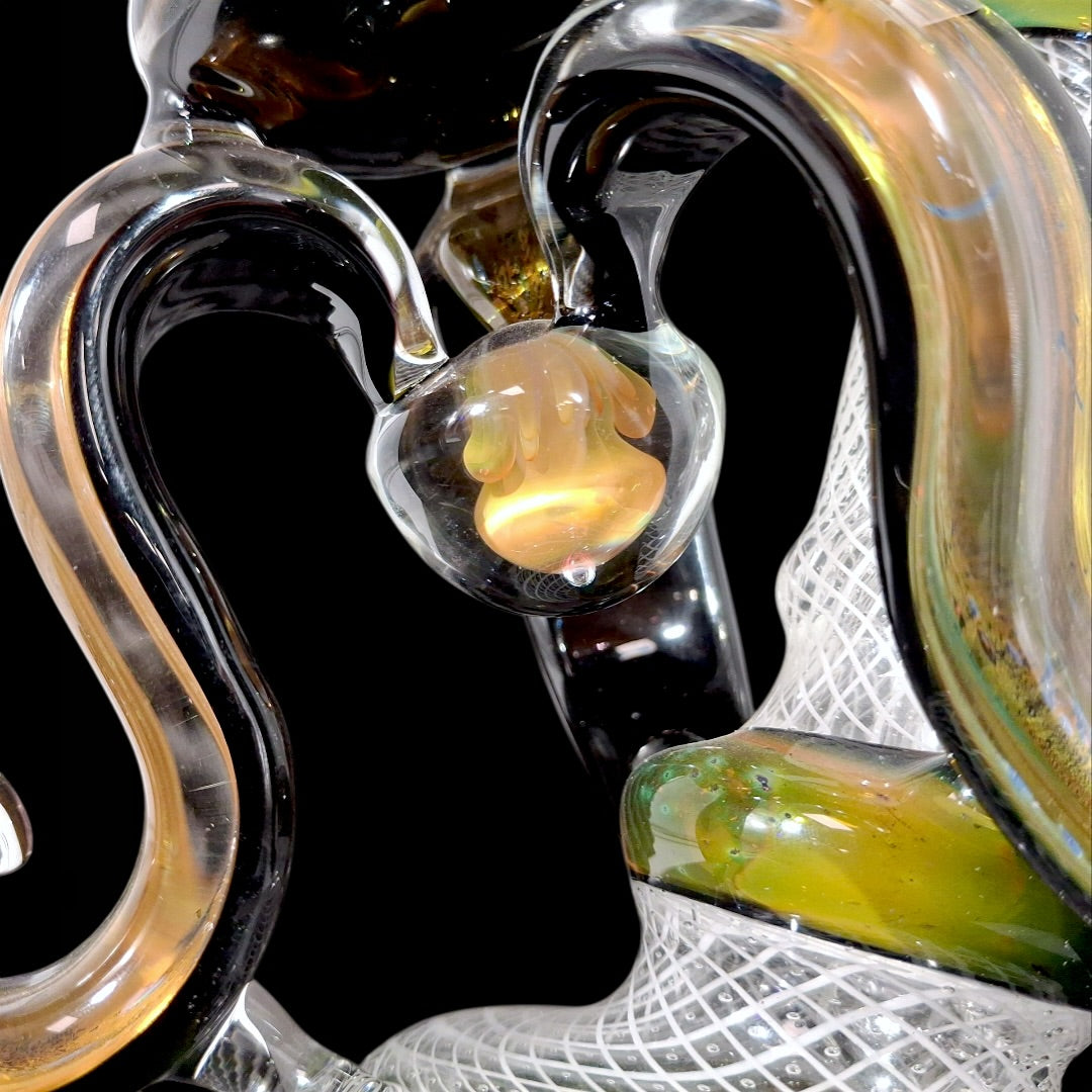 Keelo Gizmocycler Colors: Gurk Monster Dichro & Telemagenta 7 1/2” Tall 14mm joint Ti Signed Ships in Pelican A top to bottom stunner w/ excellent...