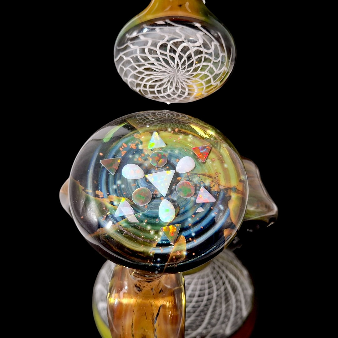 Hand made by @DosaGlass. 10mm 45˚ Female joint. 7.5 inches tall. Includes removable matching down stem. Includes Pelican, Dosa Slick, Dosa Chip & Lilis Moodmatt